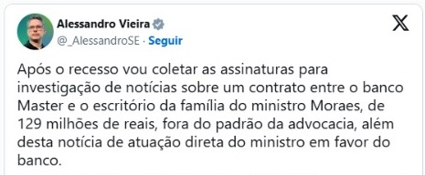 O senador Alessandro Vieira (MDB-SE) informou que, assim que o Congresso retomar os trabalhos após o recesso, pretende iniciar a coleta de assinaturas para instaurar uma apuração no Senado envolvendo um contrato firmado entre o Banco Master e um escritório de advocacia associado à família do ministro do Supremo Tribunal Federal (STF) Alexandre de Moraes.