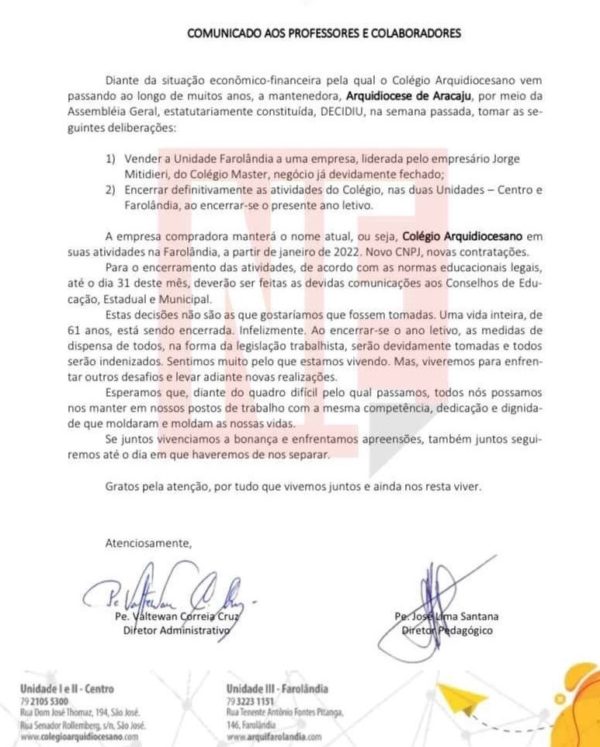 “Diante da situação econômico-financeira pela qual o Colégio Arquidiocesano vem passando ao longo de muitos anos, a mantenedora, Arquidiocese de Aracaju, por meio da Assembleia Geral, estatutariamente constituída, decidiu, na semana passada, vender a Unidade Farolândia a uma empresa, liderada pelo empresário Jorge Mitidieri, do Colégio Master, negócio já devidamente fechado, e encerrar definitivamente as atividades do colégio”, diz nota da Arquidiocese.
