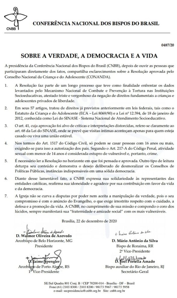 A presidência da Conferência Nacional dos Bispos do Brasil (CNBB) se manifestou nesta terça-feira sobre a aprovação da Resolução do Conanda, que permite a visita íntima para o menor infrator, em que autoriza que menor a partir de 12 anos de idade tenha relações sexuais dentro das dependências das unidades socioeducativas.