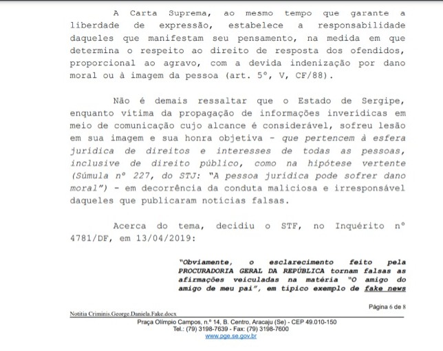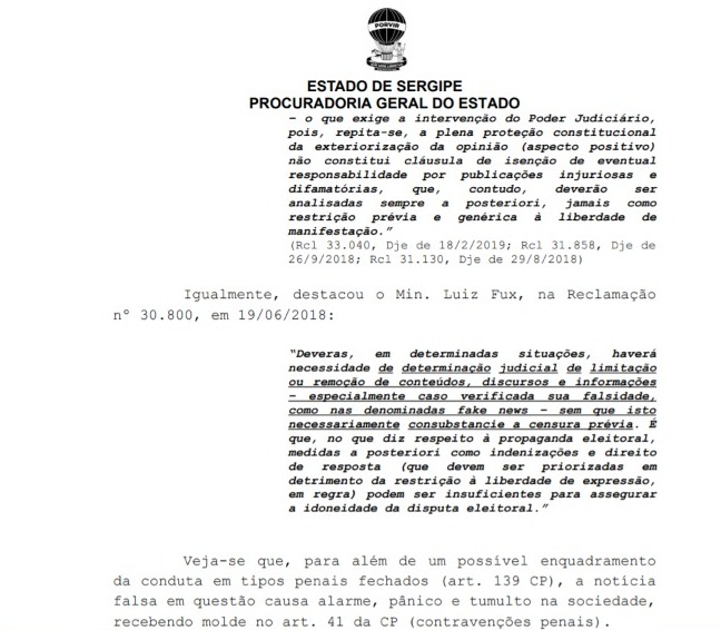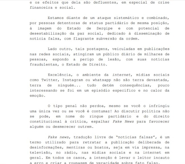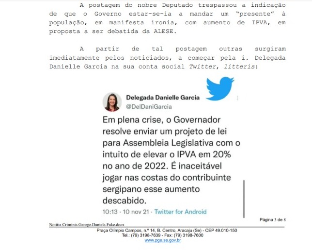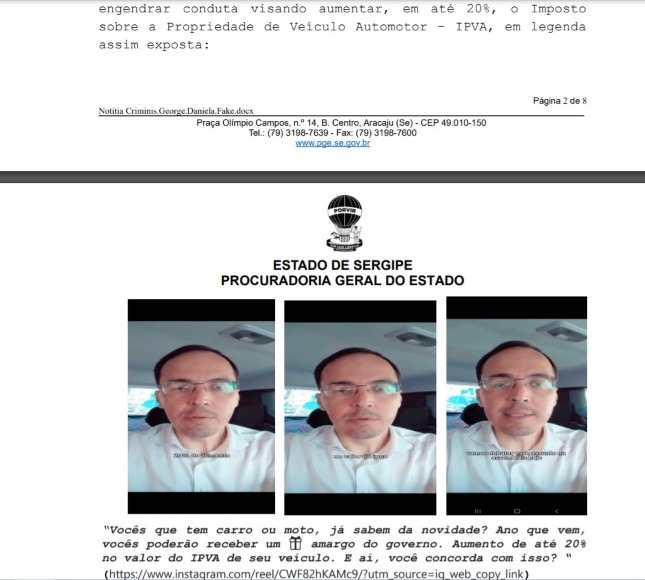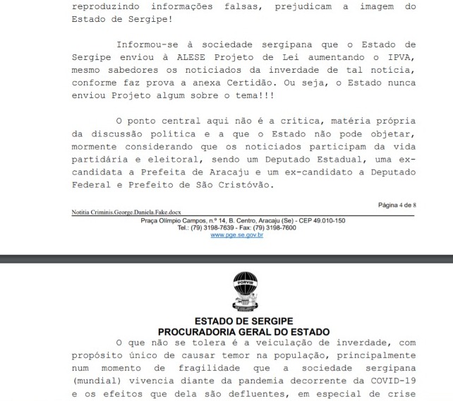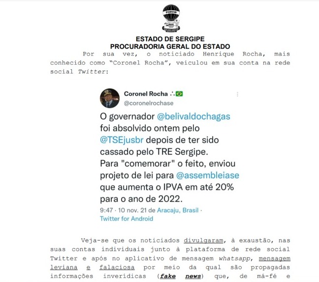 Segundo o documento jurídico que o Hora News teve acesso com exclusividade, os representados teriam postado em suas redes sociais notícia falsa de que o governador Belivaldo Chagas estaria enviando à Assembleia Legislativa de Sergipe (Alese) projeto de lei visando aumentar, em até 20%, o Imposto sobre a Propriedade de Veículo Automotor (IPVA).