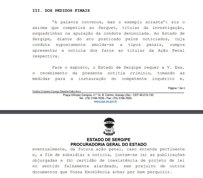 Para provar que se trata de uma falsa notícia, a Procuradoria Estadual encaminhou ao procurador-geral de justiça Manoel Cabral Machado Neto uma certidão de inexistência do referido projeto de lei, e pede que a notícia crime seja recepcionada pelo chefe do Ministério Público do Estado de Sergipe e que medidas cabíveis sejam adotadas para instauração de inquérito e possível ação penal.