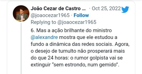 “Mas a ação brilhante do ministro Alexandre mostra que ele estudou a fundo a dinâmica das redes sociais. Agora, o desejo de tumulto não prosperará mais do que 24 horas: o rumor golpista vai se extinguir “sem estrondo, num gemido”. Mais: o desejo de tumulto virará crime”, acrescenta.