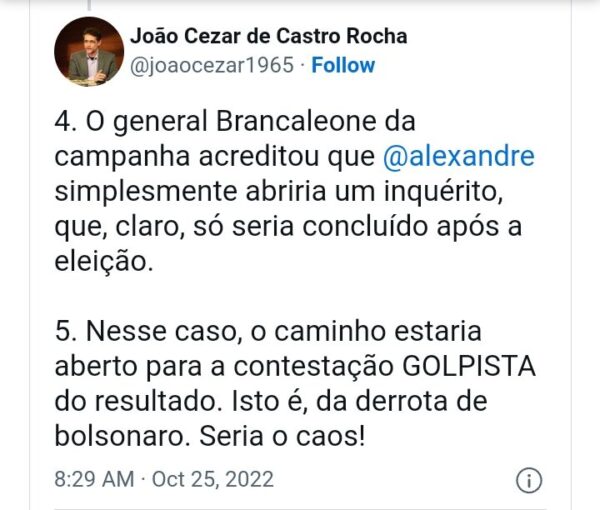 “O general Brancaleone da campanha acreditou que Alexandre simplesmente abriria um inquérito, que, claro, só seria concluído após a eleição. Nesse caso, o caminho estaria aberto para a contestação golpista do resultado. Isto é, da derrota de Bolsonaro. Seria o caos!”, observa.