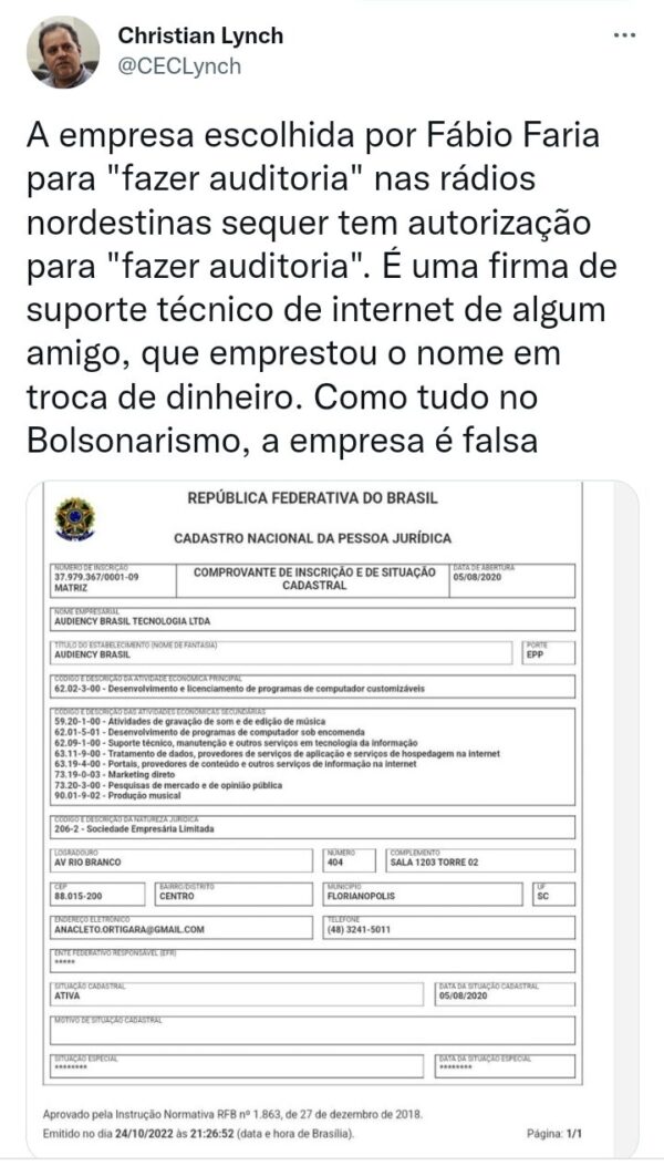 “A empresa escolhida por Fábio Faria para “fazer auditoria” nas rádios nordestinas sequer tem autorização para “fazer auditoria”. É uma firma de suporte técnico de Internet de algum amigo, que emprestou o nome em troca de dinheiro. Como tudo no bolsonarismo, a empresa é falsa”, relata Christian no Twitter.