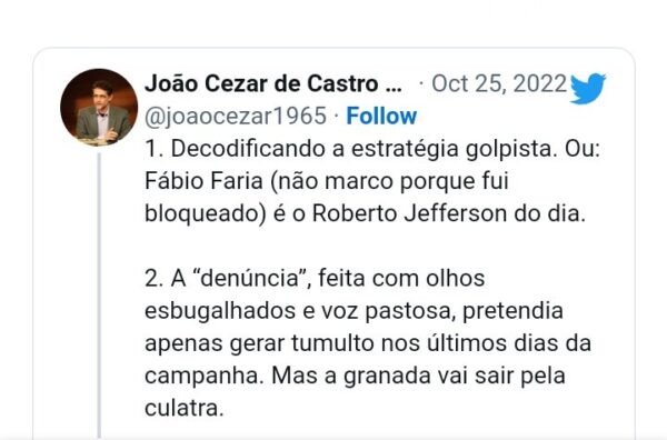 “Decodificando a estratégia golpista. Ou: Fábio Faria é o Roberto Jefferson do dia. A “denúncia”, feita com olhos esbugalhados e voz pastosa, pretendia apenas gerar tumulto nos últimos dias da campanha. Mas a granada vai sair pela culatra”, escreve o professor, acrescentando que os estrategistas não contavam com a inteligência e esperteza do presidente do Tribunal Superior Eleitoral (TSE).