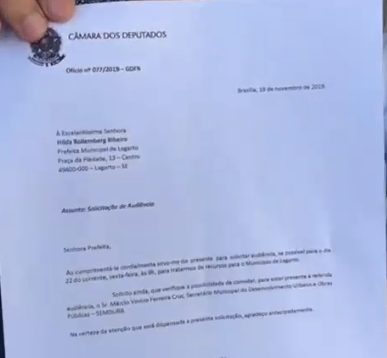 “Na última segunda-feira eu fiz questão de pessoalmente ligar para a prefeita Hilda Ribeiro para que pudesse agendar nesta sexta-feira uma audiência com ela para que possamos tratar de assuntos de interesse do município. Não obtive resposta e no dia seguinte protocolei este ofício solicitando uma audiência com ela. Foi recebido pela sua secretária e também não obtivemos sucesso. E hoje pela manhã tivemos a felicidade de protocolar na Secretaria de Obras R$ 9 milhões em investimentos para o município de Lagarto”, salienta o deputado federal Fábio Reis.