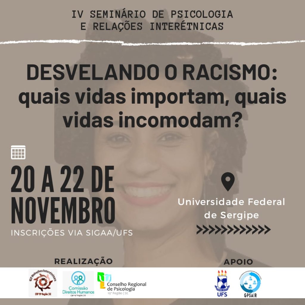 Com o tema “Desvelando o Racismo: quais vidas importam, quais vidas incomodam?”, o Conselho Regional de Psicologia da 19ª Região (CRP19), por meio do Grupo de Trabalho Psicologia e Relações Interétnicas, realiza a quarta edição do SEMPRI – Seminário Psicologia e Relações Interétnicas. O encontro acontece de 20 a 22 de novembro, na Universidade Federal de Sergipe, campus São Cristóvão (SE).