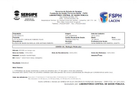 O exame foi feito através do método RT-PCR, no dia 17 de janeiro. A análise informa que o deputado estava com a doença. A recomendação é o isolamento social por 14 dias a partir do resultado do exame, mas 10 dias depois Gustinho Ribeiro já estava em meio a centenas de pessoas e sem máscara.