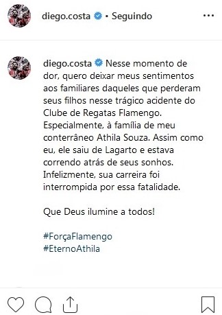 Pelo Twitter, Diego Costa lamentou a tragédia e se solidarizou com a família do jovem atleta.