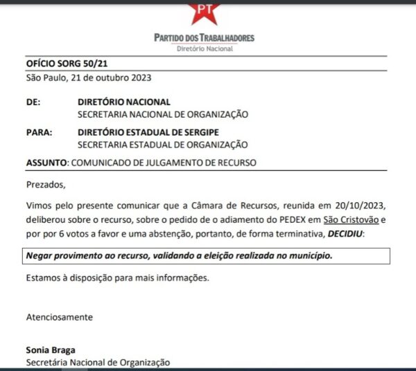 “Prezados, vimos pelo presente comunicar que a Câmara de Recursos, reunida em 20/10/2023, deliberou sobre o recurso, sobre o pedido de o adiamento do PEDEX em São Cristóvão e por por 6 votos a favor e uma abstenção, portanto, de forma terminativa, decidiu: Negar provimento ao recurso, validando a eleição realizada no município. Estamos à disposição para mais informações”, diz documento assinado pela secretária nacional de Organização, Sônia Braga, que o Hora News teve acesso.