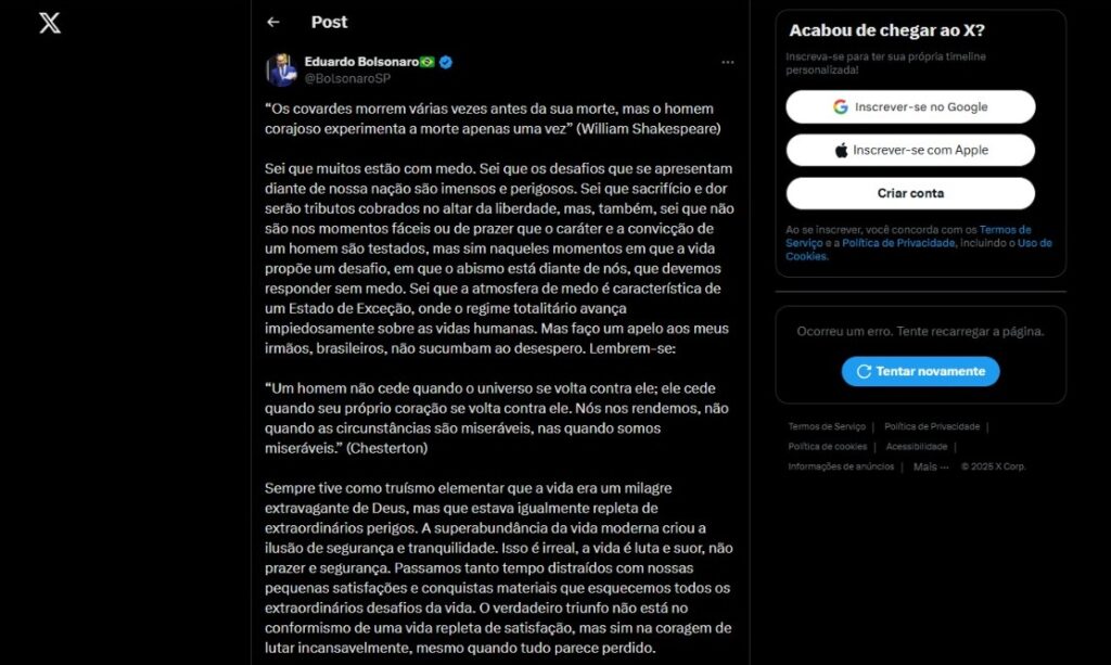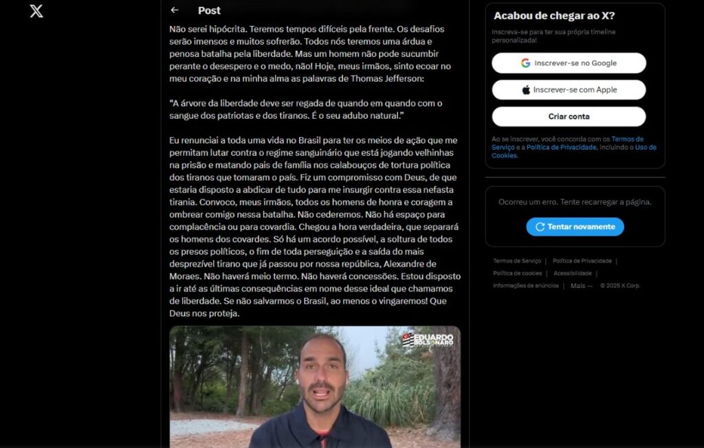 Em um manifesto divulgado recentemente, o deputado federal licenciado Eduardo Bolsonaro, que reside atualmente nos Estados Unidos, voltou a atacar as instituições brasileiras e conclamou “homens de honra e coragem” a se levantarem contra o que classificou como “regime sanguinário”. O texto, recheado de referências literárias e históricas, traz críticas contundentes ao Supremo Tribunal Federal (STF) e apelos à mobilização nacional.