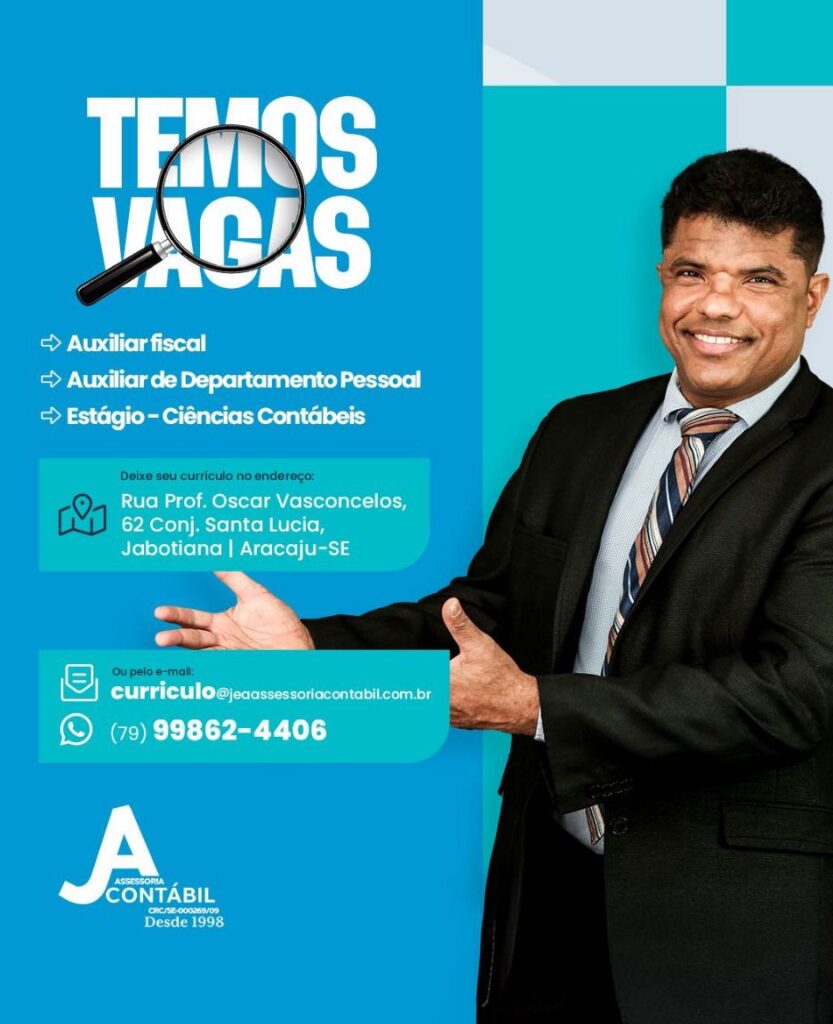 Os interessados devem enviar currículo para o e-mail curriculo@jeaassessoriacontabil.com.br ou entrar em contato pelos telefones (79) 99993-4545 e (79) 99862-4406. O endereço da empresa é Rua Professor Oscar Vasconcelos, nº 62, Conjunto Santa Lúcia, Bairro Jabotiana – Aracaju/SE.