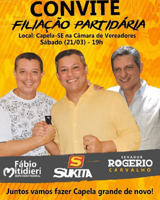 Rogério Carvalho havia prometido apoiar a filiação do ex-prefeito capelense ao Partido Trabalhista Brasileiro (PTB), inclusive participando do ato de filiação de Sukita ao partido. O ato de filiação estava agendado para o sábado, dia 21 deste mês, às 19h, no plenário da Câmara Municipal de Capela.