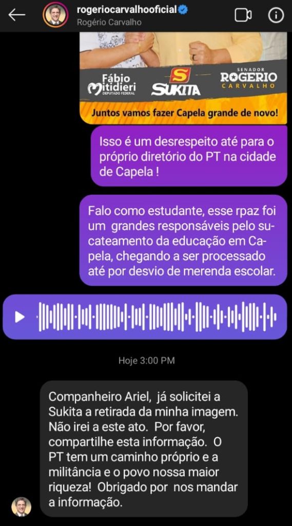“Senador Rogério, aqui quem fala é Josemar, eu sou da cidade de Capela e coloco para o senhor que estou extremamente decepcionado e indignado com o seu posicionamento. Eu tive a oportunidade de está presente com Sukita no momento em que ele atendeu uma ligação do senhor nas tratativas justamente deste evento, que estava marcado para o dia 21. A data foi escolhida pelo senhor, eu pude ouvir, porque estava bem próximo. O Sukita foi bem claro: queria o senhor participando de todos os atos, só aceitava o partido oferecido se o senhor participasse de todos os atos de forma clara, a exemplo do que o saudoso Marcelo Déda fez em 2008, que chegou a pedir licenciamento do PT em respeito à história de Sukita, a história que Sukita construiu com o PT”, desabafa o empresário Josemar Góes Santos em áudio que o Hora News teve acesso com exclusividade.