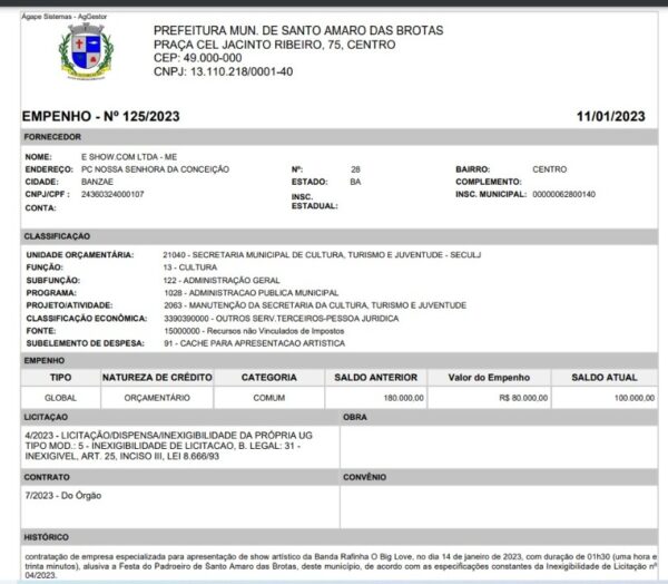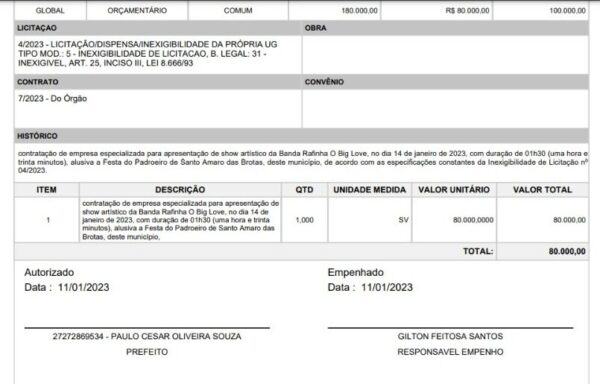 Entre as denúncias feitas pelo ex-prefeito Chileno à Rádio Cidade FM, está a contratação do cantor Rafinha Big Love, que teve valor empenhado em R$ 80 mil. O mesmo cantor, segundo Chileno, cobrou apenas R$ 10 mil para se apresentar em uma festa particular na região. A diferença de preços é de 700% a mais, segundo a denúncia.