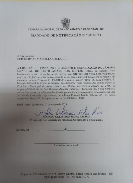 O documento encaminhado ao ex-prefeito é assinado pelo presidente da Comissão de Finanças, Orçamento e Fiscalização, Márcio Gleibison Silva Passos.