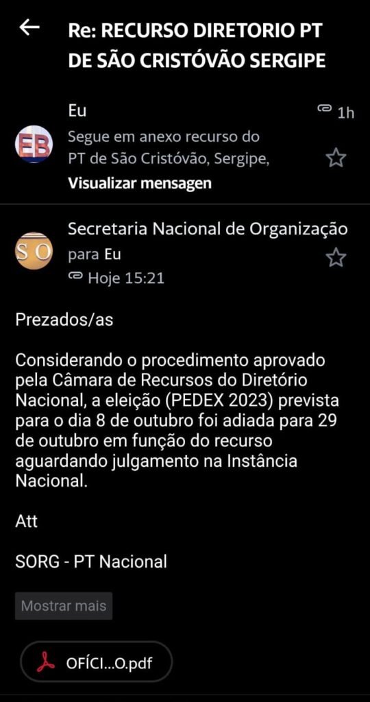 Na mensagem, a Secretaria Nacional de Organização confirma aprovação do recurso de São Cristóvão pela Câmara de Recursos do Diretório Nacional do partido.