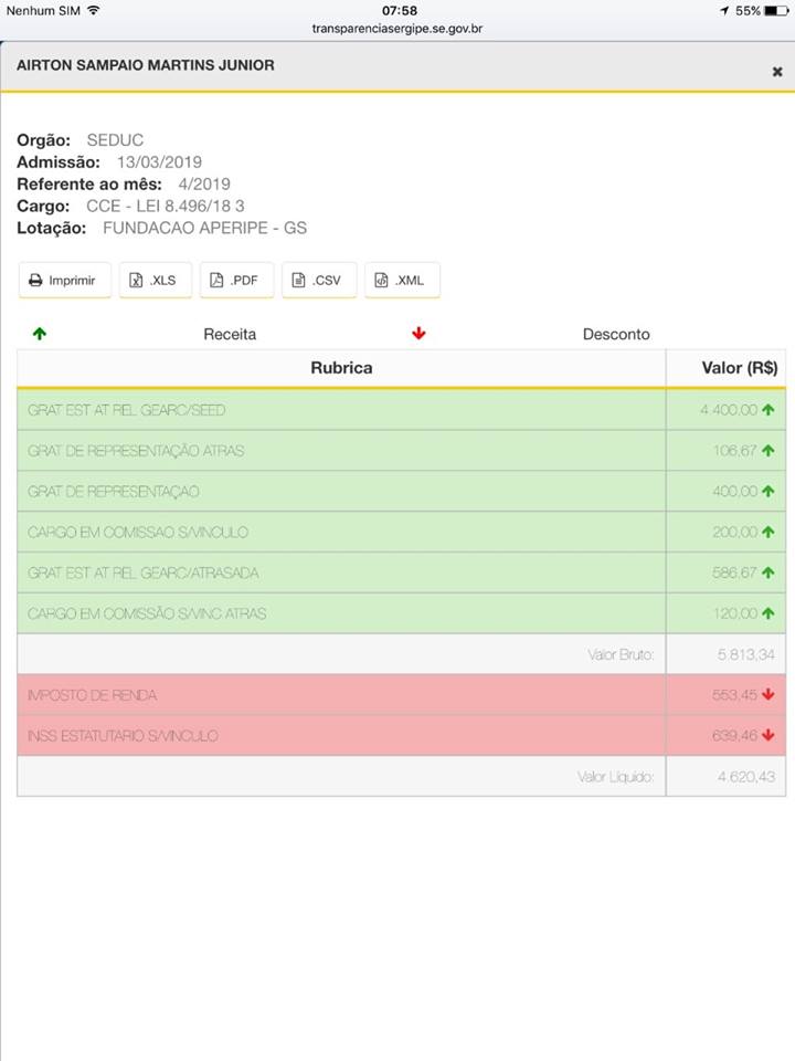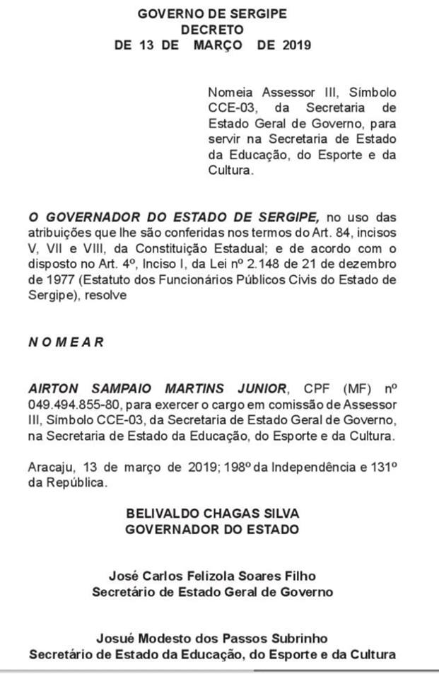 O jovem Airton Sampaio Martins Junior foi nomeado pelo governador no dia 13 de março deste ano, para o cargo de Assessor III, Símbolo CCE-03, da Secretaria de Estado Geral do Governo, na Secretaria de Estado da Educação, Esporte e Cultura. Ele foi lotado na Fundação Aperipê, que passa por uma forte crise financeira.