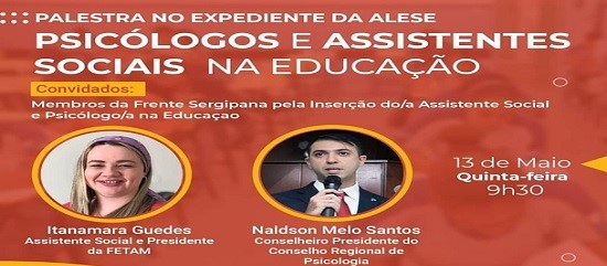 Na semana em que se comemora o Dia do Assistente Social, a Frente Sergipana Pela Inserção do Assistente Social e do Psicólogo na Educação (FIASPE) ocupará a tribuna da Assembleia Legislativa de Sergipe para explanar sobre a necessidade de regulamentação, por parte do Governo de Sergipe, da Lei Federal Nº 13.935/19, que prevê a inclusão de profissionais de Serviço Social e Psicologia na rede pública de educação.