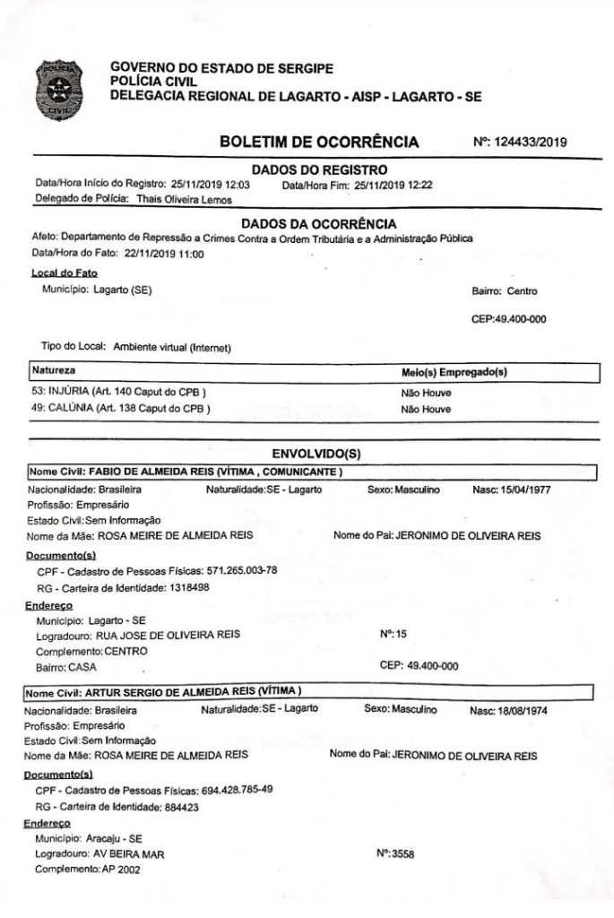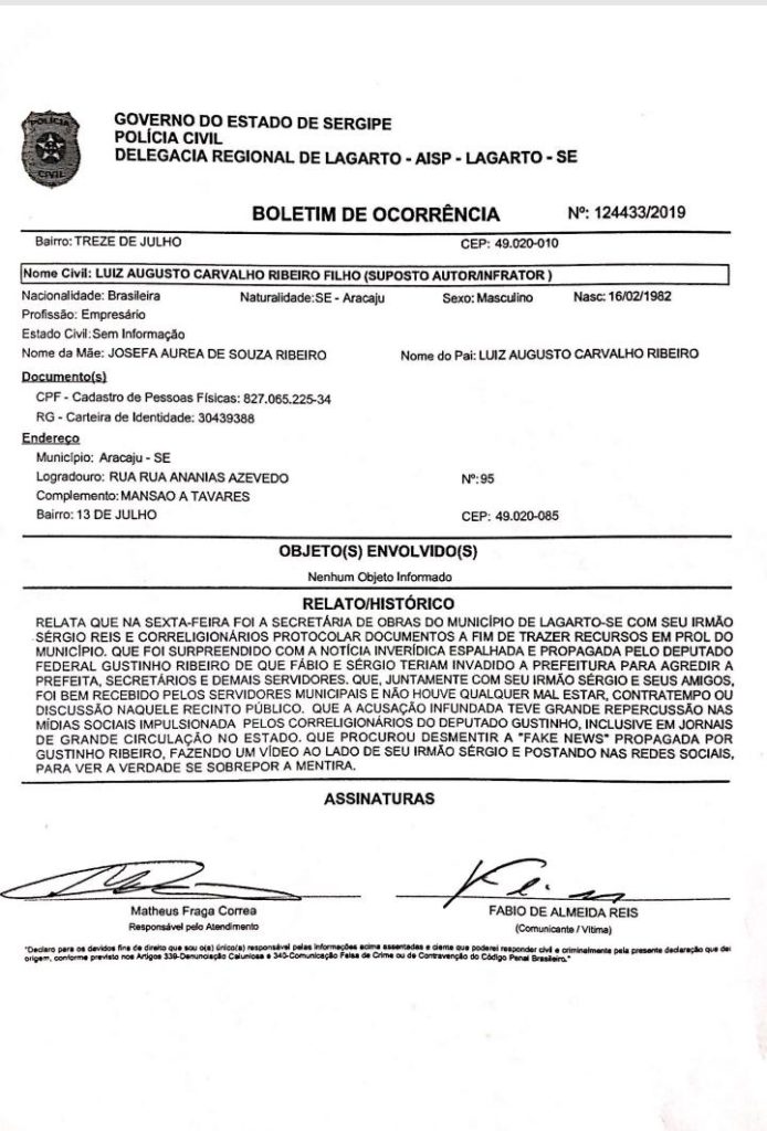 Foi aberto um Boletim de Ocorrência na Delegacia de Lagarto por ele ter compartilhado uma notícia falsa acusando o deputado Fábio Reis (MDB) e o ex-deputado Sérgio Reis de tentar invadir a prefeitura do município do centro-sul e, acreditem, agredir a prefeita, mas na verdade eles, acompanhado de vereadores, foram protocolar recursos para pavimentação de ruas. A Polícia Civil agora investigará o caso.