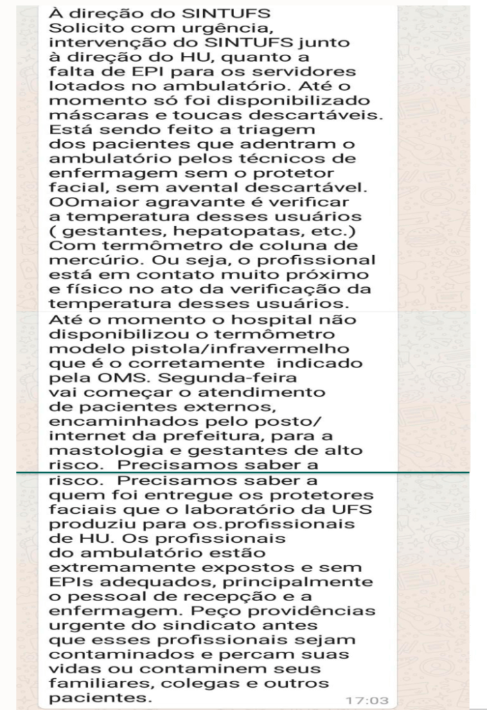 Em comunicado eletrônico enviado no dia 5 de maio, a Coordenação Executiva do Sintufs a para a “persistência dos problemas quanto as medidas de proteção aos trabalhadores da UFS”. O comunicado ressalta boa parte dos relatos expostos nesta reportagem, além de exigir um posicionamento por parte da administração da UFS e da Ebserh sobre procedimentos referentes à Nota Técnica nº 004/2020 da Anvisa. O comunicado segue sem resposta e pode ser lido na íntegra aqui. Ainda em 9 de maio, o sindicato recebe uma nova denúncia sobre as tratativas e ausência de protocolos frente ao Covid-19. Leia a denúncia completa, aqui.