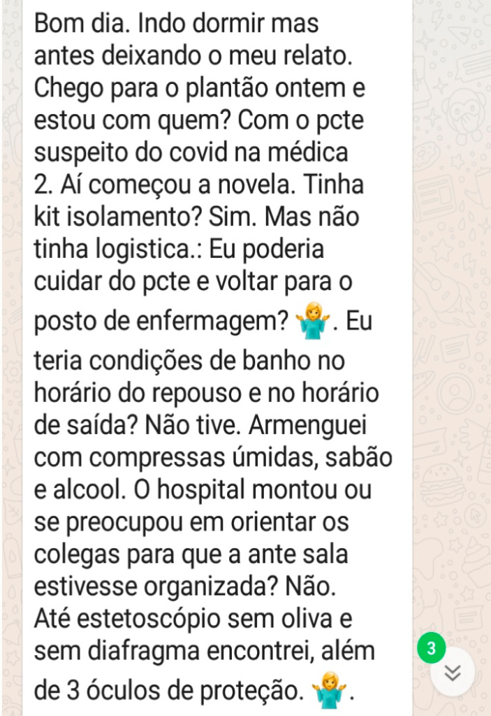 “Até o momento só foi disponibilizado máscaras e toucas descartáveis”. “Até o momento o hospital não disponibilizou o modelo termômetro pistola/infravermelho, o que é corretamente indicado pela OMS”. “Eu teria condições de banho no horário de repouso e no horário de saída? Não tive. Armenguei com compressas úmidas e álcool”. “Se falarem que deram treinamento, é mentira. Nem um boa noite eu tive”. As frases coletadas por relatos nas redes sociais falam por si só, acompanhe as imagens, abaixo.