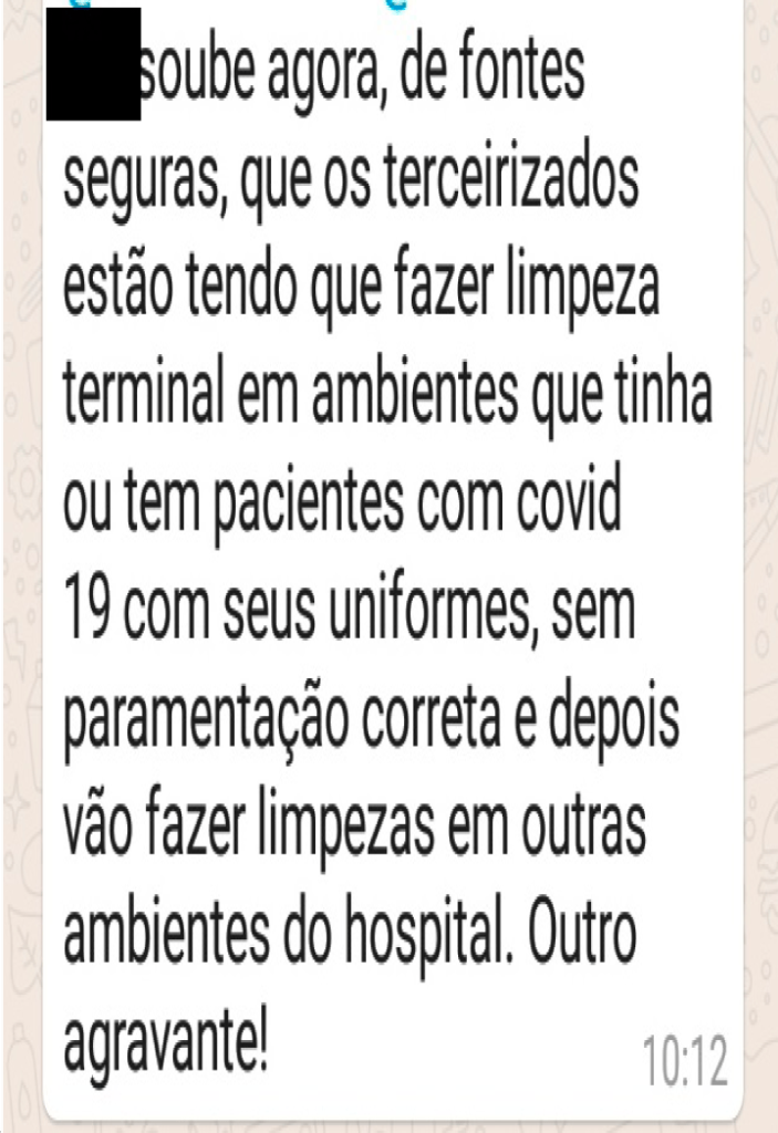 “Soube agora, de fontes seguras, que os terceirizados estão tendo que fazer limpeza terminal em ambiente que tinha ou tem pacientes com Covid 19 com seus uniformes, sem paramentação correta e depois vão fazer limpezas em outras do hospital. Outro agravante!” Segue mais um relato que chega aos ouvidos do sindicato. Além do descaso em relação aos terceirizados, é corrente a informação de que os funcionários com o vínculo com a Ebserh estão sendo obrigados a bater o ponto, o que configura exposição em fatores de contaminação.