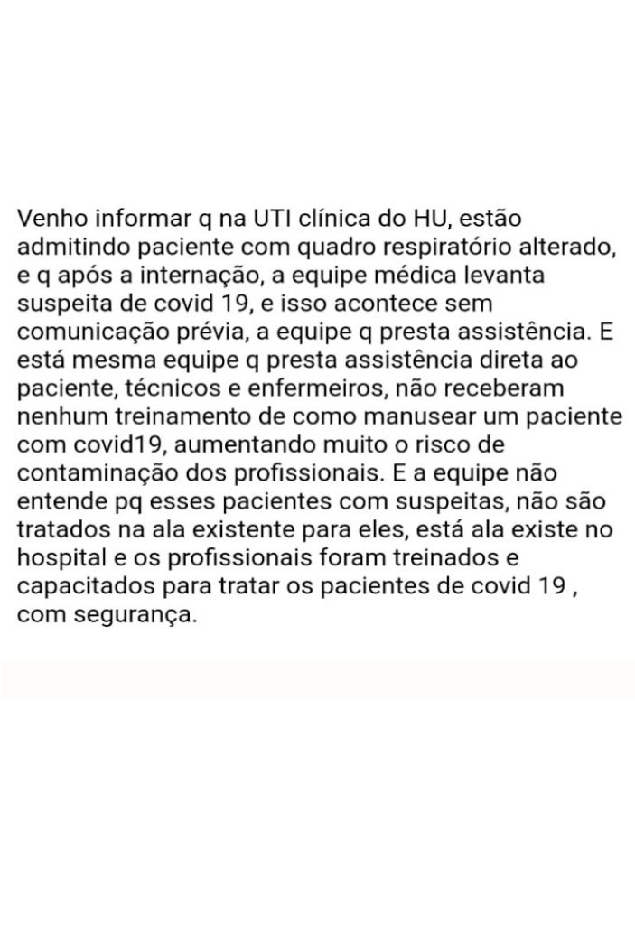 “Mesmo tendo setor específico de internamento de paciente de Covid-19, está acontecendo o internamento de pacientes suspeitos nas clínicas médicas, como aconteceu comigo e demais colegas, quando não foram disponibilizados os EPI´s adequados”, rebate mais um depoimento de uma servidora do HU, que pode ser ouvido na íntegra aqui.  Pacientes suspeitos atendidos e internados em outros setores, ausência de EPI e espaço para a devida higienização.