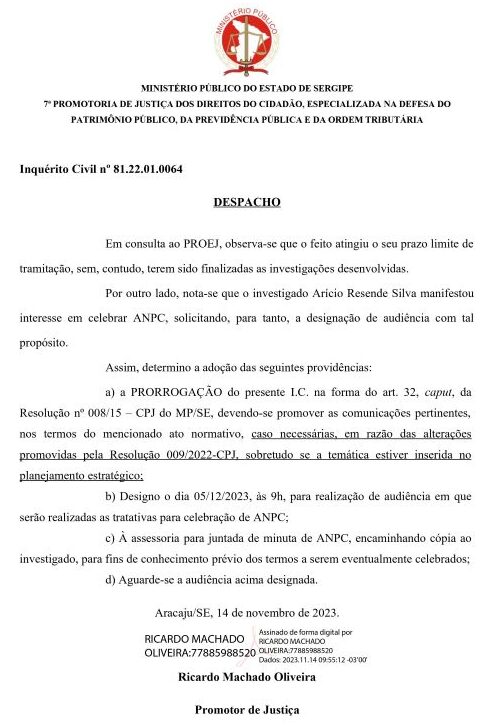 Diante da comprovação dos fatos e o reconhecimento do investigado por ofício encaminhado à Promotoria, em despacho, na última terça-feira, 14 de novembro, o promotor Ricardo Machado Oliveira propôs ao acusado, Arício Resende, o Acordo de Não Persecução Cível (ANPC) e a devolução aos cofres públicos de aproximadamente R$ 40.000,00, recebidos indevidamente quando exerceu o mandato na presidência do Crea/SE, entre os anos de 2015 a 2020.