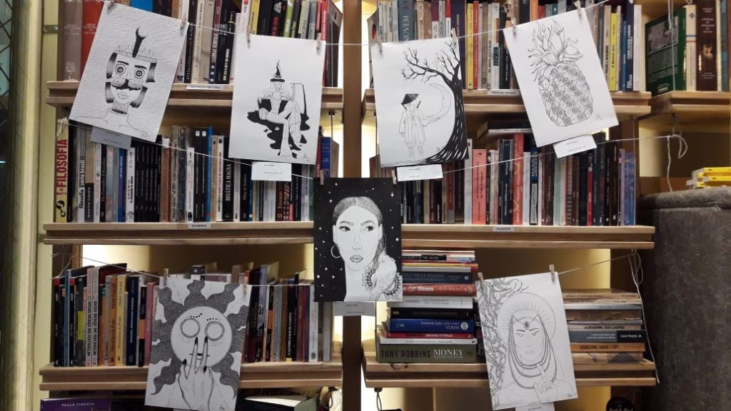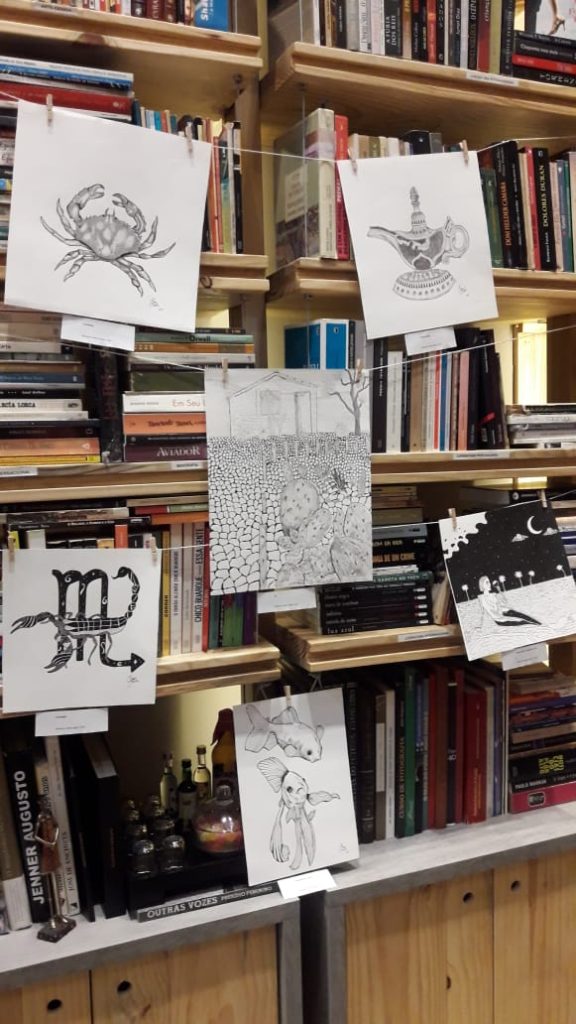 Ambiente intimista, aconchegante e familiar, num local repleto de livros, alguns modernos, outros raros, instalados em altas estantes de madeira e em meio à mobiliário de época e retrô. Em frente aos livros, em varais de cordas delicadas, surgiam gravuras e ilustrações em preto e branco, com alguns poucos tons de vermelho. Esta era a impressão inicial de quem entrasse na sala do Sebo Xique, no JFC Trade Center, ontem, segunda-feira, à tarde, durante a exposição intitulada “No Mundo da Lua”, da artista plástica Isadora Sukita.
