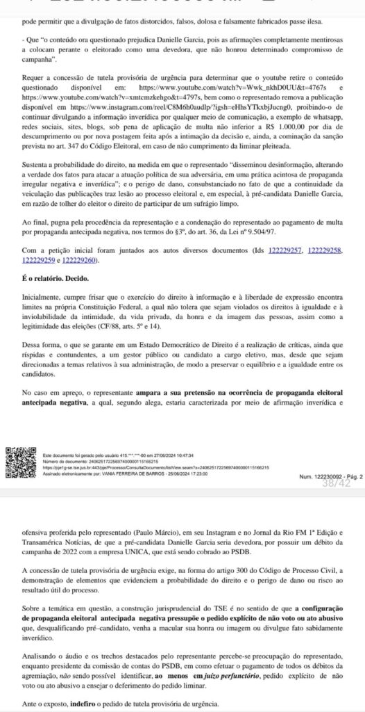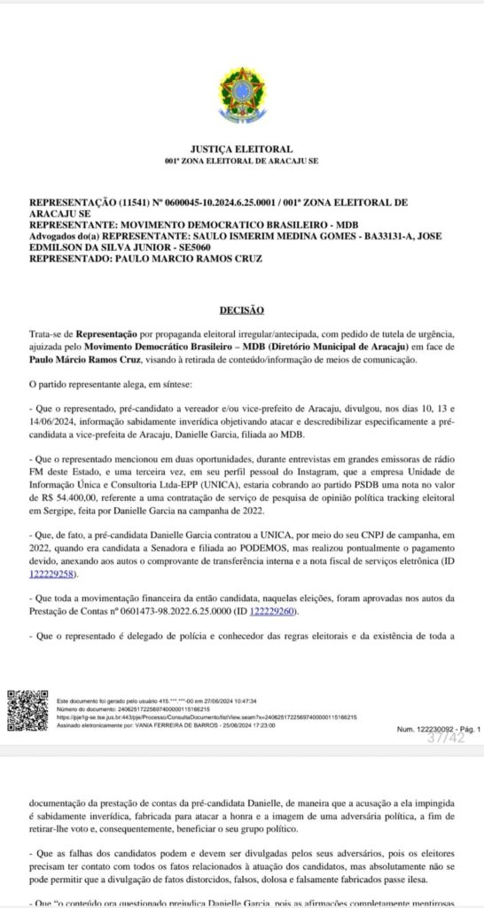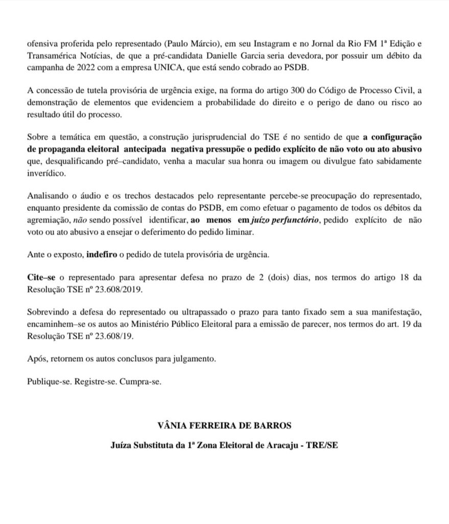 O Diretório Municipal do Movimento Democrático Brasileiro (MDB), representado por sua presidente e pré-candidata a prefeita de Aracaju, Danielle Garcia, apresentou Representação Eleitoral com pedido de tutela de urgência em face do delegado Paulo Márcio (PSDB), requerendo liminarmente a retirada imediata de vídeos do Youtube, Instagram e outras plataformas que veiculem informações sobre dívidas de campanha contraídas junto ao Única – Unidade de Informação Pesquisa e Consultoria LTDA nas eleições de 2022 e que estão sendo cobradas ao PSDB.