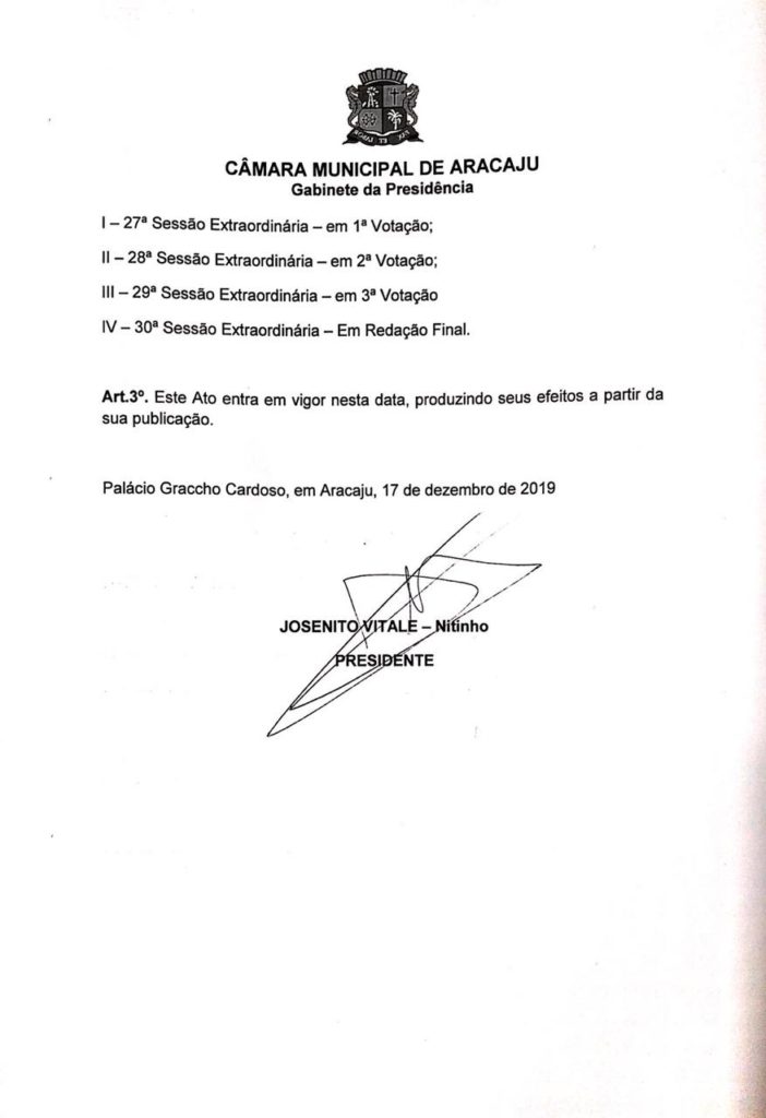 O presidente da Câmara Municipal de Aracaju (CMA), Josenito Vitale, o Nitinho, decidiu revogar os dois projetos de lei aprovados que elevam os salários do prefeito, do vice-prefeito, dos secretários municipais e dos vereadores, que teriam validade a partir de 1º de janeiro de 2021.