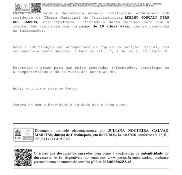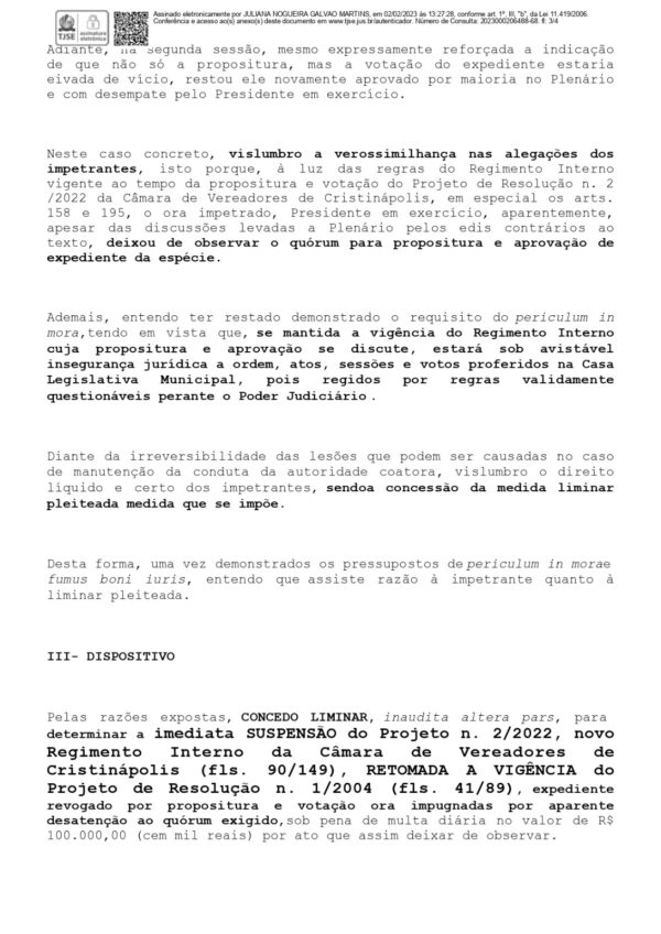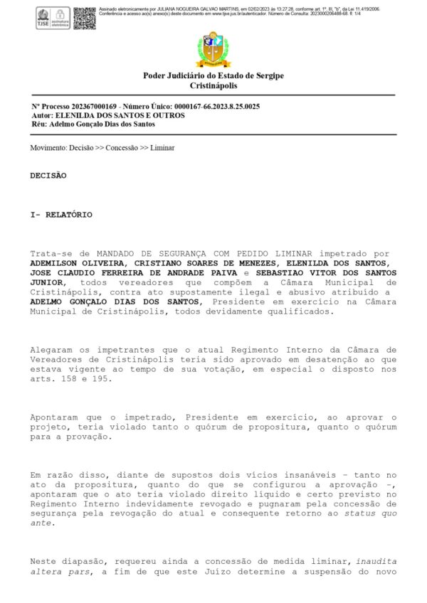 Como dizem os sertanejos, a merda começou a talhar quando nos dias 20 e 22 de dezembro de 2022 foi realizada uma Sessão Extraordinária, onde o referido projeto foi colocado em votação e ‘aprovado’ por maioria simples, ou seja, foram seis votos a favor e cinco contrários. Com isso, após os trâmites restantes, o Regimento Interno antigo foi revogado e o novo passou a vigorar. A questão foi parar nos tribunais, quando os vereadores Ademilson Oliveira, Cristiano Soares de Menezes, Elenilda dos Santos, José Claudio Ferreira de andrade Paiva e Sebastião Vitor dos Santos Junior, percebendo a distorção da aprovação do PL frente ao regimento interno em vigor para a reformulação e implementação de um novo, impetraram mandado de segurança contra o presidente da Câmara.