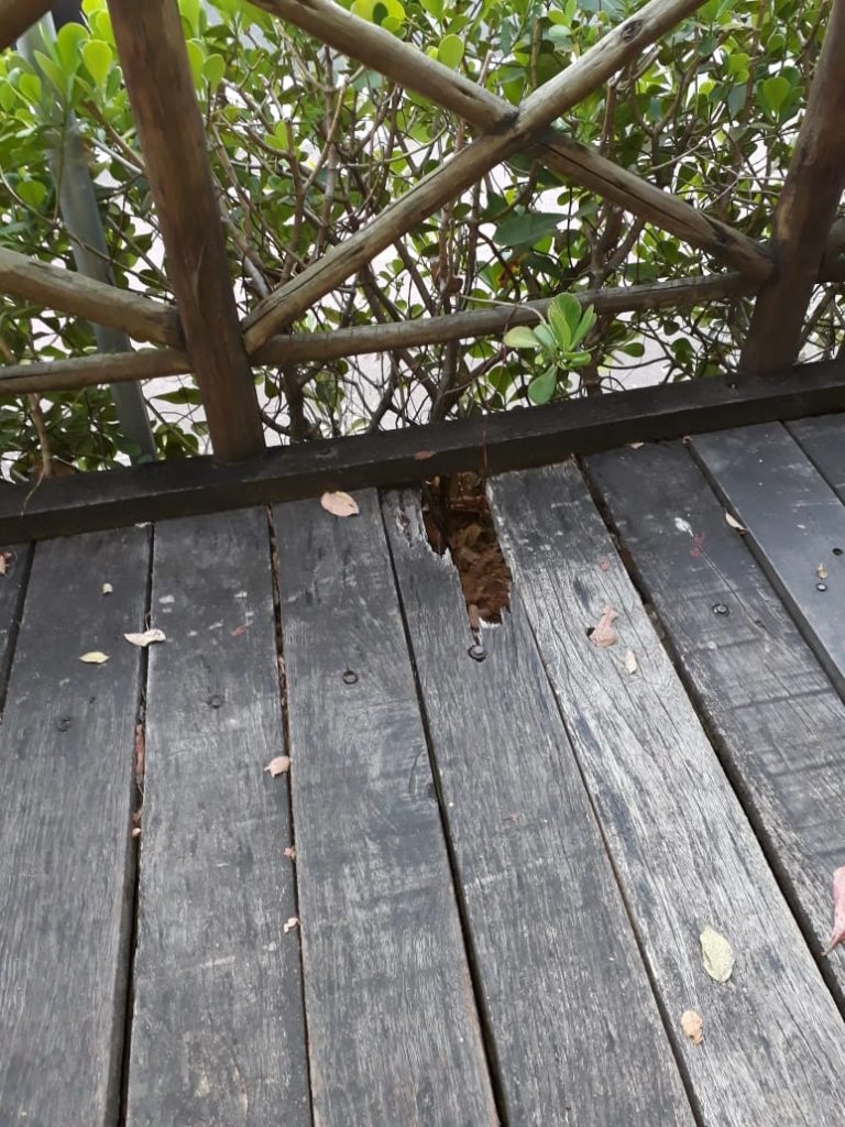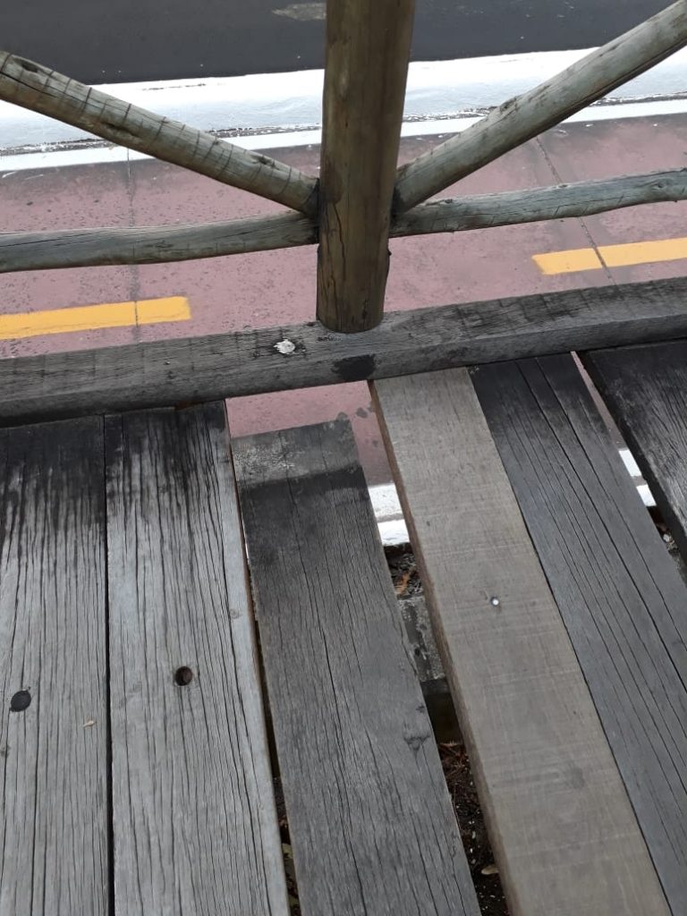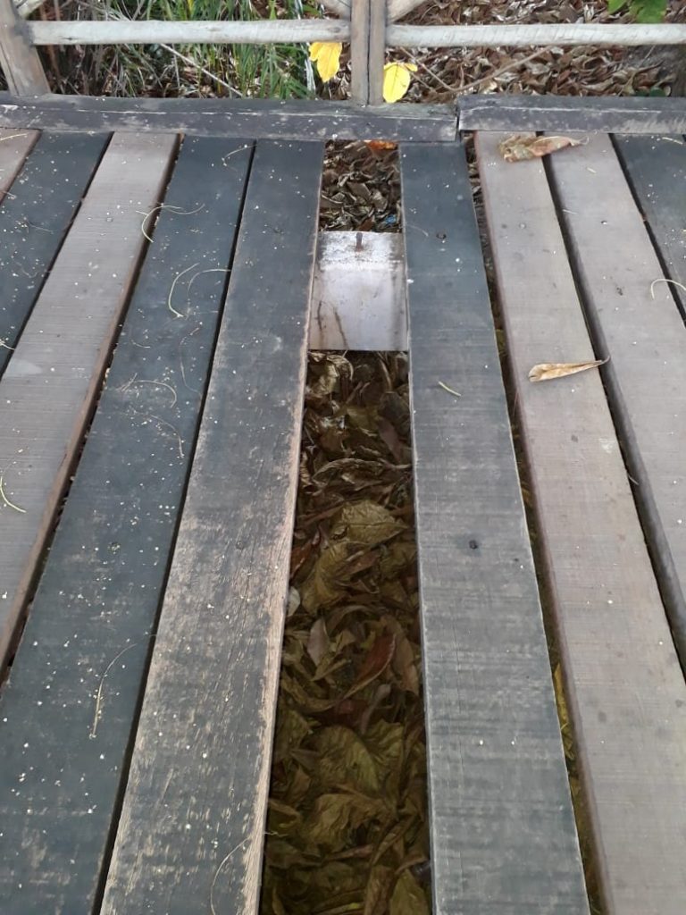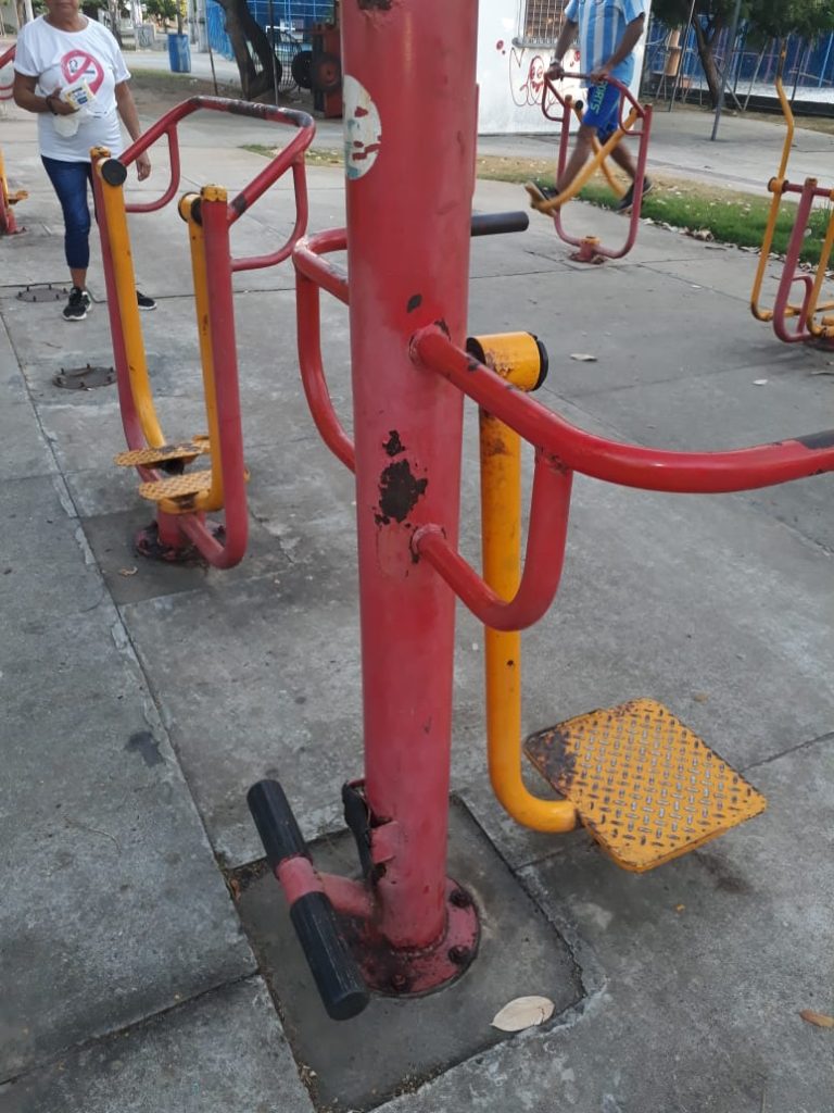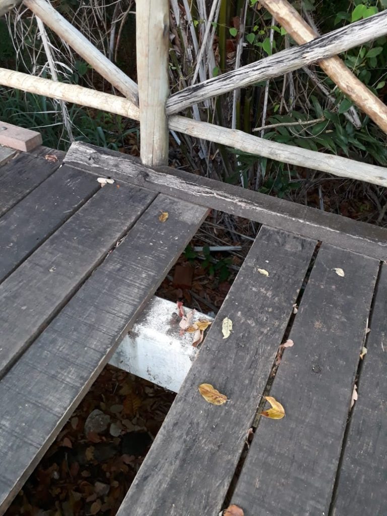 Aparelhos para o exercício de atividades físicas estão quebrados, sendo que vários foram retirados para conserto e até hoje não foram reinstalados. Já a passarela de madeira apresenta vários defeitos. Além da madeira rachada, em vários pontos se observa a passarela quebrada e com ausência do piso de madeira, que pode provocar um acidente a qualquer momento.