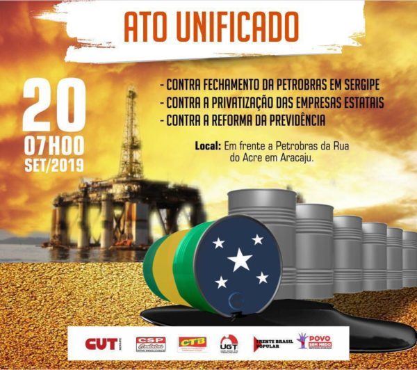 Trabalhadores da Petrobras e de outras áreas profissionais realizam nesta sexta-feira (20), na Rua Acre, em frente a sede da empresa em Aracaju, um ato público contra a privatização da estatal e o possível fechamento da sede da empresa em Sergipe, bem como a reforma previdenciária.