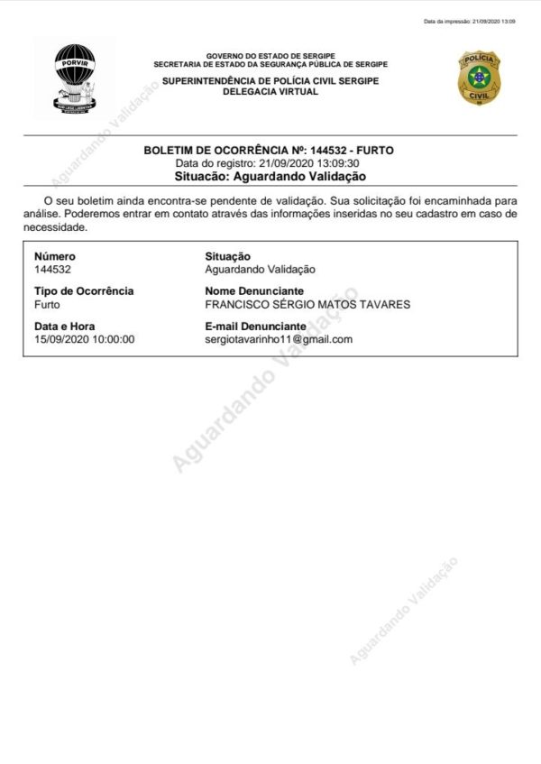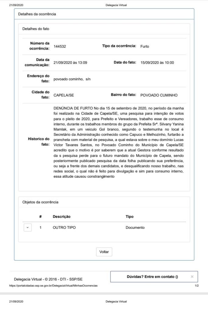 “No dia 15 de setembro de 2020, no período da manhã foi realizada na cidade de Capela uma pesquisa para intenção de votos para o pleito de 2020, para prefeito e vereadores, trabalho esse de consumo interno. Durante os trabalhos, membros do grupo da prefeita Silvany Yanina Mamlak, em um veículo Gol branco, segundo testemunha no local, conhecidos como Capuco e Melhozinho, furtaram a prancheta com material de pesquisa, a qual estava sobe o domínio de Lucas Victor Tavares Santos”, denuncia.