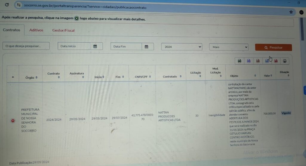 “Cantor Nattanzinho, agradecendo ao prefeito de Nossa Senhora do Socorro, Padre Inaldo, pelo valor recebido para cantar uma hora na abertura do Forró Siri, no dia 31 de maio de 2024. Enquanto isso, o povo do Guajará, Santa Cecília e adjacências, continua na lama e no buraco”, lamenta, salientando que enquanto o prefeito promove festa milionária, a população sofre com a falta de medicamentos nos postos de saúde.