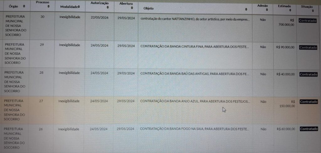 Todas as atrações foram contratadas pela administração municipal com dispensa de licitação.