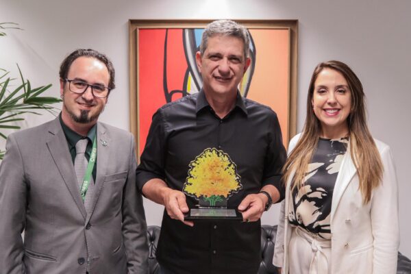 O representante do Confies, Bruno Portela, entregou ao senador um troféu de reconhecimento pela atuação em defesa das fundações de apoio durante a tramitação da reforma tributária.