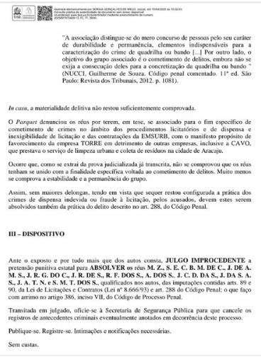 “Tendo em vista que sequer restou configurada a prática dos crimes de dispensa indevida ou fraude à licitação, pelos acusados, devem estes serem absolvidos também da prática do delito”, diz a juíza Soraia Gonçalves de Melo, da 3ª Vara Criminal de Aracaju.
