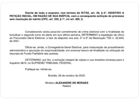 “Diante de todo o exposto, nos termos do RiTSE, art. 36, § 6o, INDEFIRO A PETIÇÃO INICIAL, EM RAZÃO DE SUA INÉPCIA, com a consequente extinção do processo sem resolução do mérito (CPC, art. 330, § 1o, c/c art. 485, I)”, justifica Moraes, que ainda determinou o envio do caso para o Supremo Tribunal Federal (STF), no âmbito do inquérito que apura a atuação de uma “milícia digital” que atenta contra a democracia.