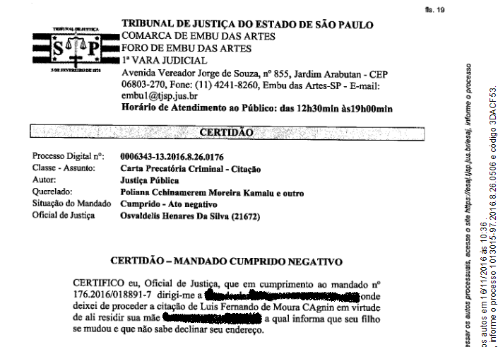 “Durante este tempo, oficiais de Justiça buscaram Moura nos endereços constantes em suas contas de telefone celular e outros serviços, e também na casa de sua mãe (que disse que o filho tinha se mudado dali, mas que ela não sabia para onde), sem nunca encontrá-lo”, destaca reportagem do site Diário do Centro do Mundo.