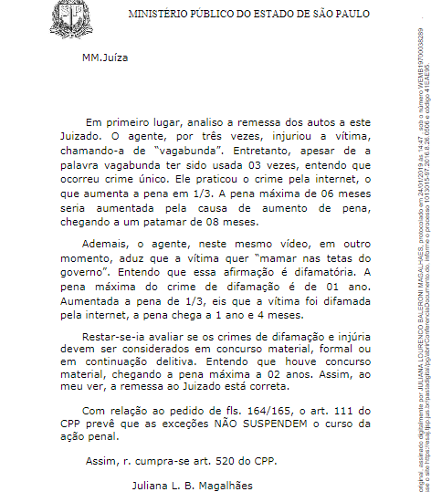 Na ação, que ficou parada desde o final de 2015 pelo fato do oficial de Justiça não ter conseguido localizar o réu para notifica-lo, o Ministério Público requer a condenação de Nando Moura a pena de dois anos de prisão.