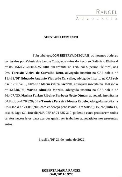 Documento oficial que o Hora News teve acesso, revela que Valmir de Francisquinho contratou uma das mais importantes bancas de advocacia do país, a Rangel Advocacia, que tem como integrantes os advogados Tarcísio Vieira de Carvalho Neto, Eduardo Augusto Vieira de Carvalho, Caroline Maria Vieira Larceda, Marina Almeida Morais, Marian Furlan Ribeiro Barbosa Netto Otman e Tannise Ferreira Moura Rabelo.