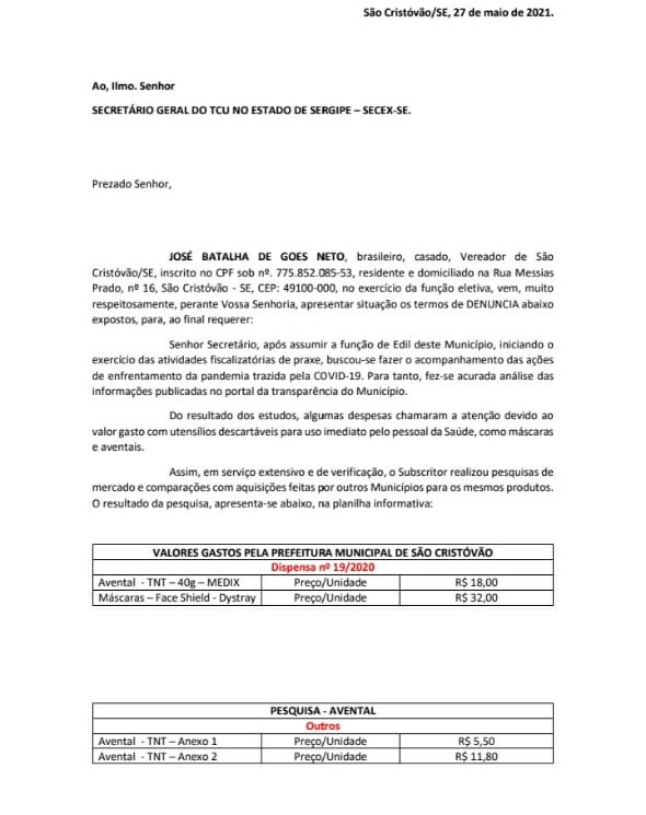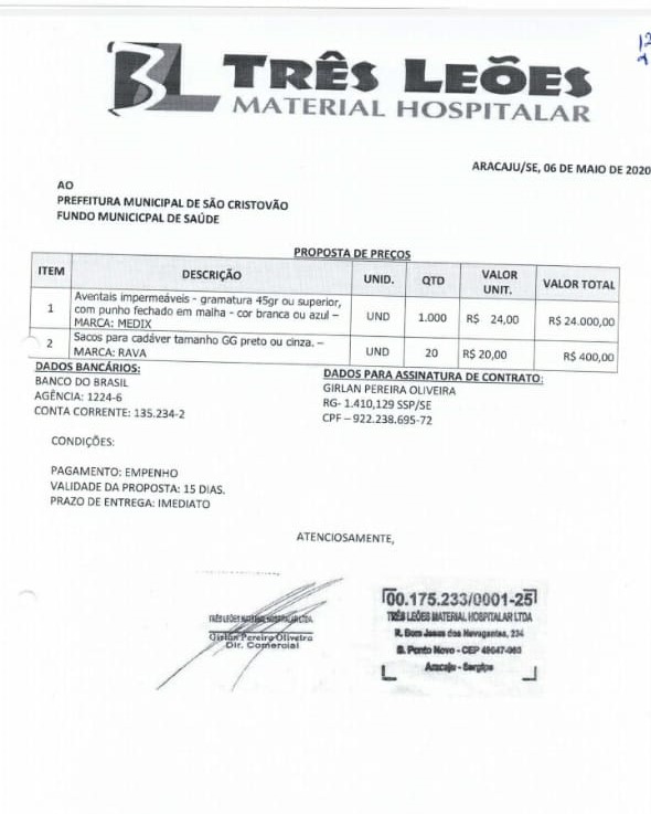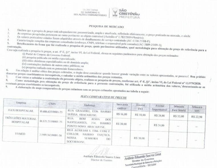 Uma longa e minuciosa investigação apontou que a Prefeitura de São Cristóvão adquiriu materiais de combate à Covid-19 com preço até seis vezes maior que a média de mercado durante à pandemia. As compras ocorreram em maio de 2020 e representam um prejuízo de R$ 76.910 mil aos cofres públicos do município. Toda investigação foi feita pelo vereador Neto Batalha (PP).