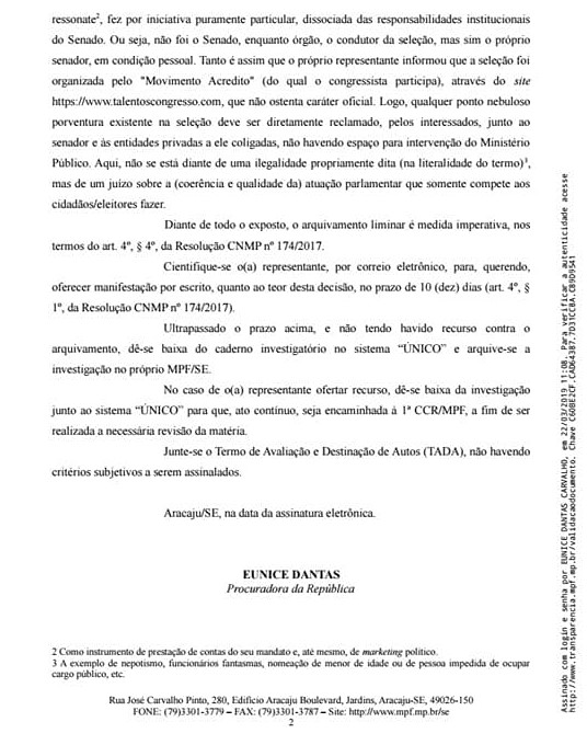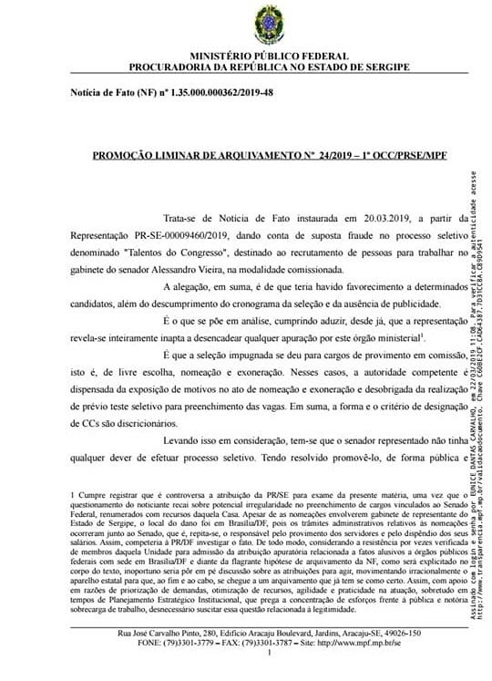 “Eu respeito à decisão da competente procuradora Eunice Dantas ao informar sobre o arquivamento da denúncia, embora eu discorde e tenho ainda a possibilidade de recurso”, observa Welder Ban, acrescentando que concorreu ao cargo de assessor de relacionamento e não ao de assessor de comunicação/imprensa e que em nenhum momento a denúncia teve por objetivo desgastar a imagem do senador Alessandro Vieira, uma das gratas revelações da política brasileira, especialmente sergipana.
